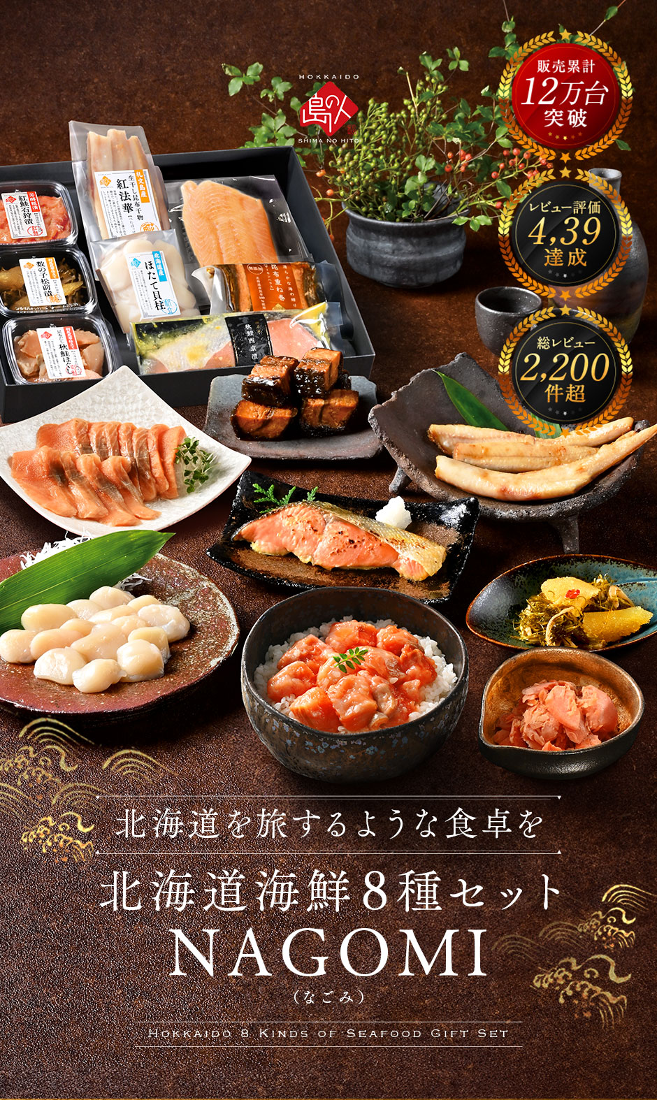| 商品内容 | 【北海道海鮮8点セット(冷凍) NAGOMI】 〇ゴロっと数の子松前漬 40g 〇紅鮭の石狩漬 40g 〇昆布だし秋鮭ほぐし 40g 〇サーモンハラス昆布重ね巻(1/3) 〇北海道産 秋鮭切り身(西京漬け) 80g 〇北海道産 秋鮭刺身(柵) 120g 〇北海道産 昆布干物 紅法華スティック 3本 〇北海道産 ほたて貝柱 100g |