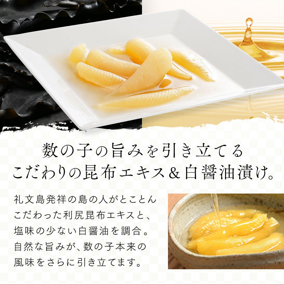 | 商品内容 | 【北海道産 味付け 数の子(折れ子)】 パリパリっとした食感がやみつきに! 白醤油であっさりと味付けしています。年末年始のめでたいお席にどうぞ。 *塩抜きなしでお召し上がりいただけます |