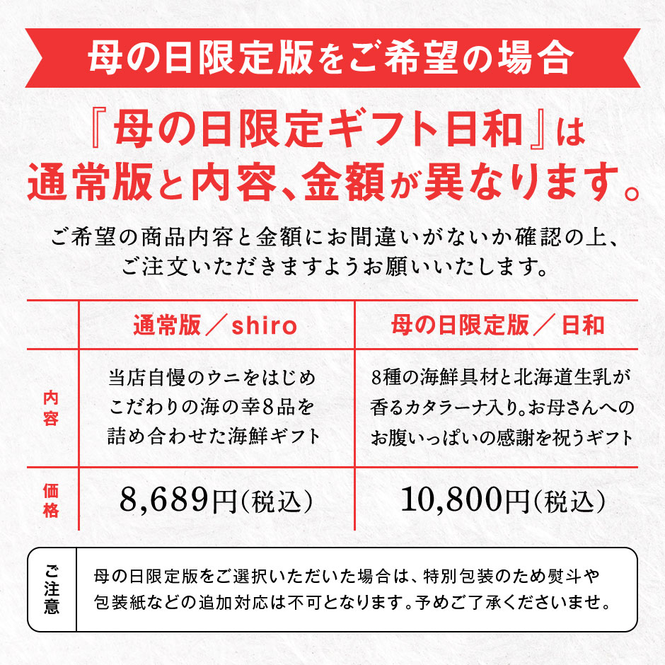 | 商品内容 | 【礼文・利尻島産 キタムラサキウニ入り豪華海鮮8種セット 島宝shiro】 ●礼文・利尻島産 旬凍キタムラサキウニ 40g×1 ●紅鮭の石狩漬 80g×1 ●北海道産 ホタテ貝柱 100g×1 ●サーモンハラス昆布重ね巻(ハーフ)×1 ●北海道産 秋鮭西京漬け 120g×1 ●礼文島産 低温熟成利尻昆布だしほっけフィーレ 1枚 ●北海道加工 味付け数の子(折れ子) 70g×1 ●昆布干物 北海道産 開きニシン 1尾 【母の日限定 海鮮セット 日和】 <海鮮具材8品> 北海道斜里産 昆布だし秋鮭いくら 50g 北海道加工 7種の海鮮漬け 100g 北海道産 秋鮭ほぐし 70g 北海道産 いしもちガレイの昆布〆 40g 北海道産 数の子(切れ子) 60g 北海道産 ボイルほっきのお刺身 5枚 北海道産 蒸しホタテ 4玉 カナダ・ノルウェー産 ボイルズワイガニポーション 4本 <母の日ギフト限定同梱スイーツ> 富良野メロンカタラーナ |