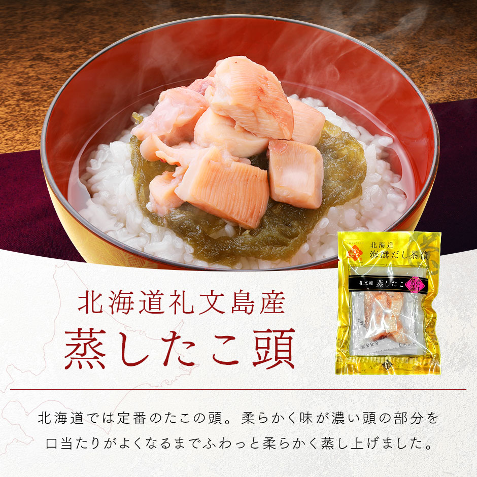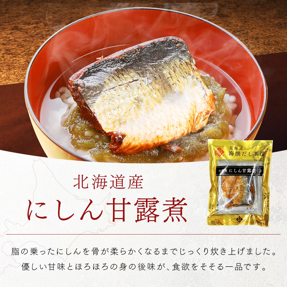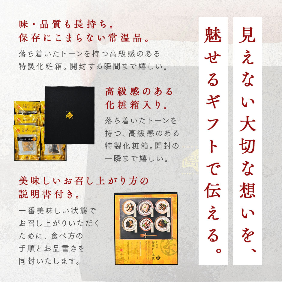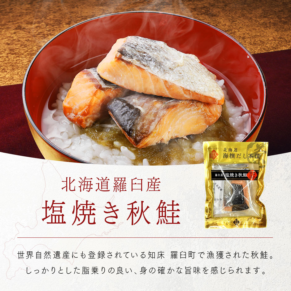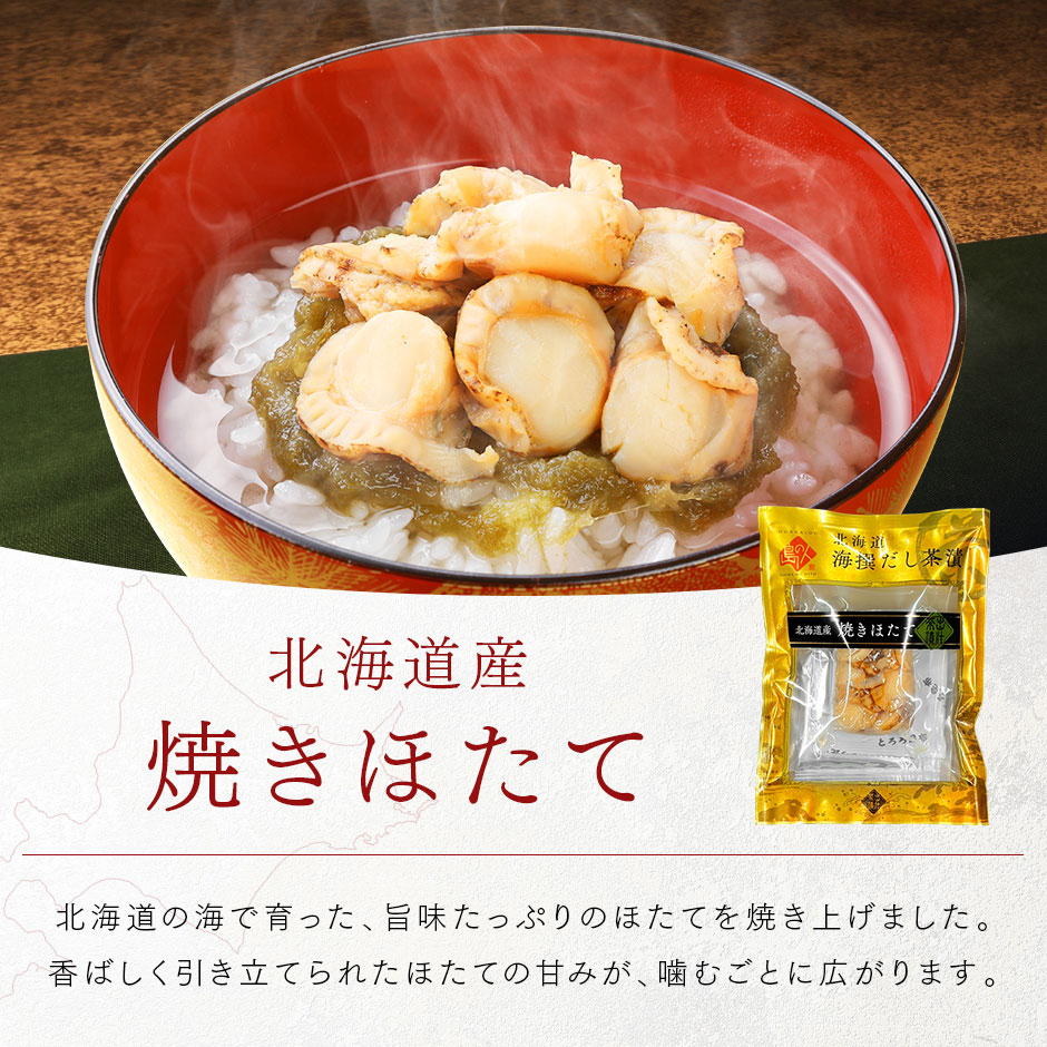 | 商品内容 | 【海鮮だしお茶漬けセット 6種入り】 全て北海道産 ○ 羅臼産 塩焼き秋鮭 60g ○ 知内産 蒸し牡蠣 30g ○ 北海道産 にしん甘露煮 50g ○ 礼文産 蒸したこ (頭) 40g ○ 釧路産 塩焼き鯖 40g ○ 北海道産 焼きほたて 8玉 ※各具材ごとにとろろ昆布が付属 原材料:商品ラベルに記載 |