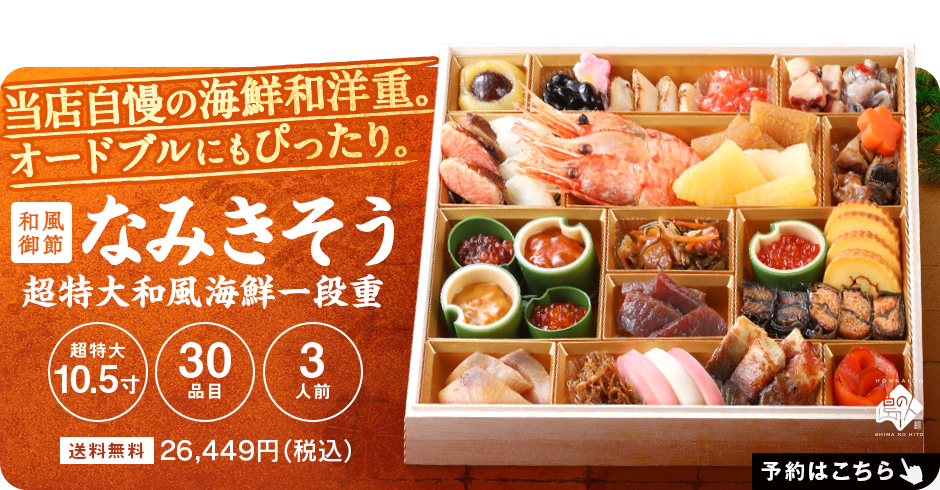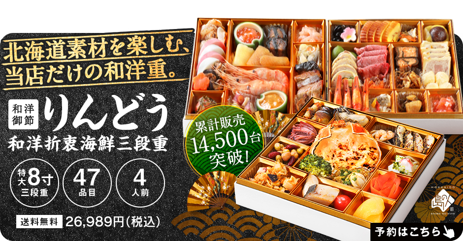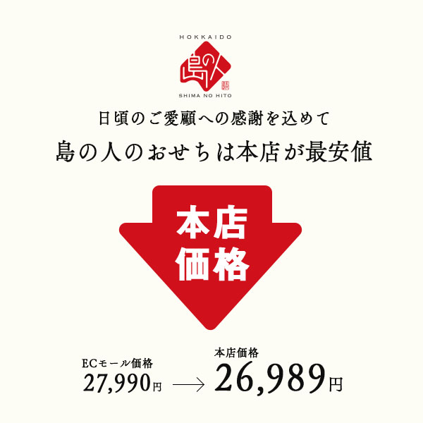 【島の人 店長より】 お客様の声を元に、今年も最高傑作のおせちが仕上がりました。 2026年を迎えるにふさわしい北海道の高級海鮮おせち。 北海道の食材をふんだんに使った、カニ入りの豪華海鮮三段重です。 |