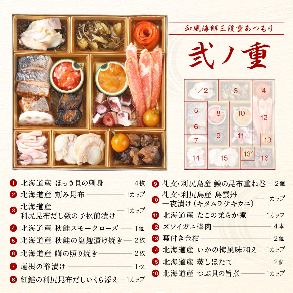 解凍は冷蔵庫での24時間前を目安として自然解凍をおすすめしております。 *「花咲蟹甲羅盛り」「ズワイガニ爪」は品質保持で、表面に氷の膜を張っています。また、解凍しすぎると水分が多く出て、旨味も失われてしまいます。 お手数ですがお重から取り出し別々での解凍をお願いします。 |