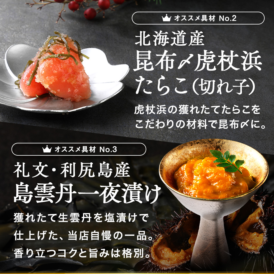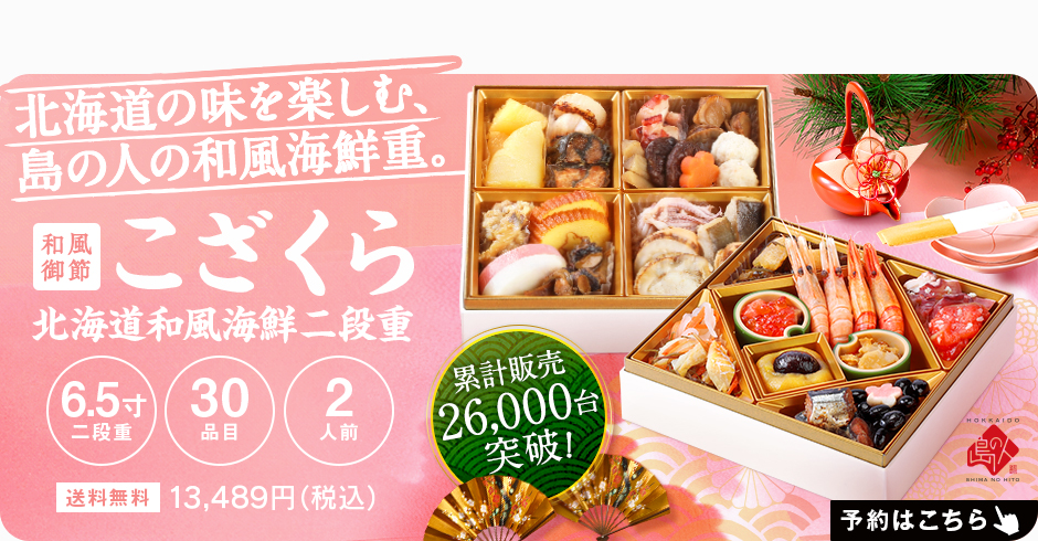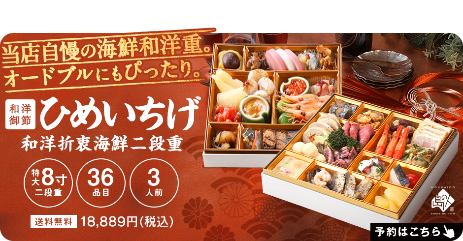 【島の人 店長より】 三段重の中に北海道の海鮮が詰まっており 大人3人で食べるのにちょうどよいボリューム感です 2026年の新春を祝うにふさわしい逸品です。 |